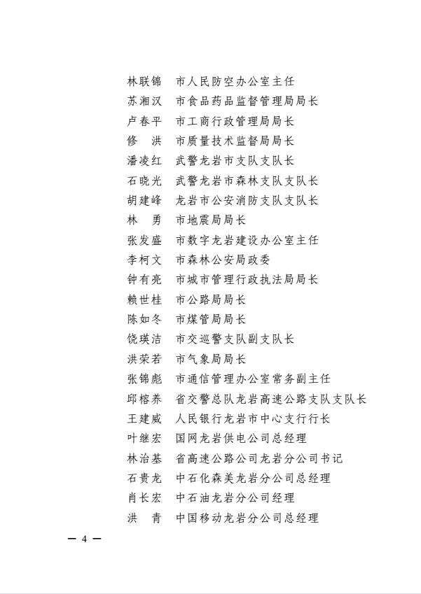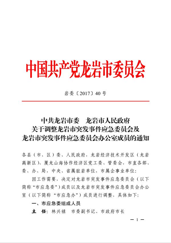市委關(guān)于調(diào)整龍巖市突發(fā)事件應(yīng)急委員會(huì)及龍巖市突發(fā)事件應(yīng)急委員會(huì)辦公室成員的通知(巖委【2017】40號(hào))