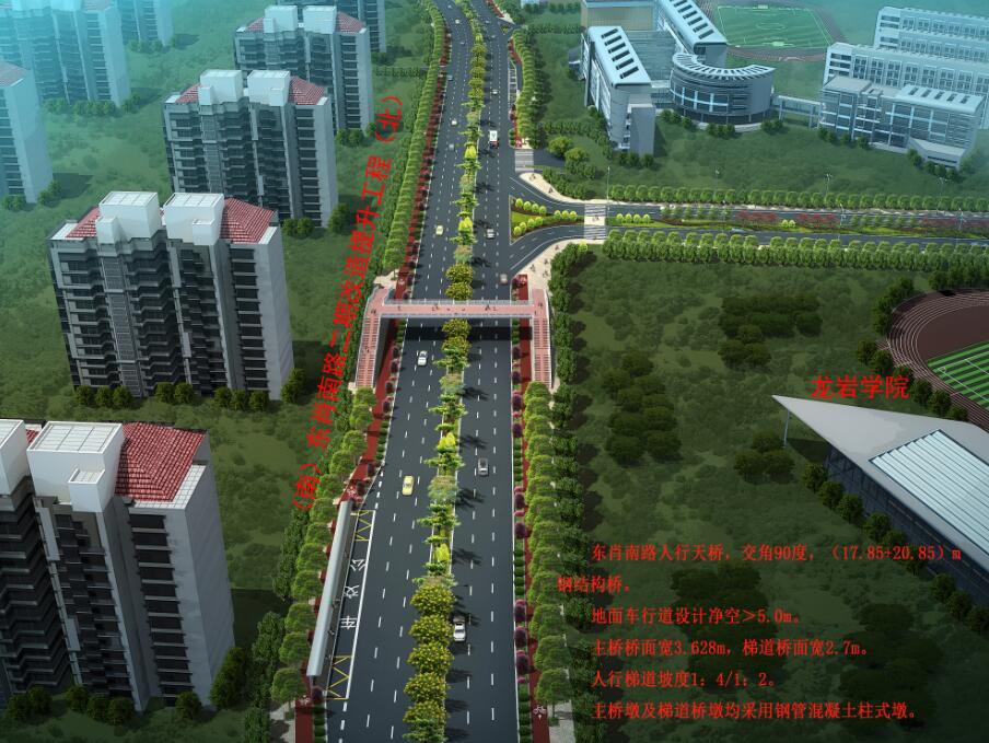 龍巖學(xué)院人行天橋位于龍巖學(xué)院大門北側(cè)約50米處,天橋采用“工”字形設(shè)計,橋面長40米、寬3.6米,兩側(cè)梯道坡度為1:4和1:2,跨度分別為17.85米和20.85米,寬2.7米,主橋墩及梯道橋墩均采用鋼管混凝土柱式墩,總投資約450萬元。